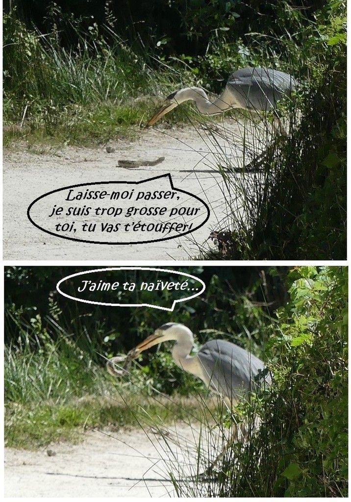 Pour ce 87ème Café Thé, je vous ai proposé de contempler ces photos du combat entre un héron et une couleuvre (photos prises à la réserve ornithologique du Teich, au détour d'un chemin) :