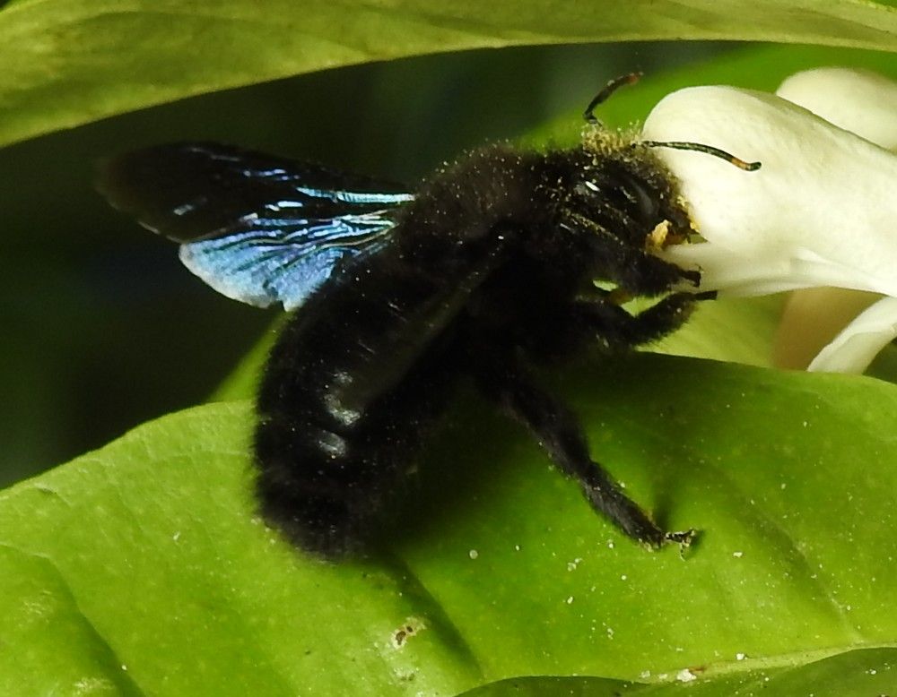 Cet insecte butineur est un voisin de l’abeille, à corps noir et ailes bleutées. Il est aussi appelé « abeille charpentière » car il creuse son nid dans le bois.