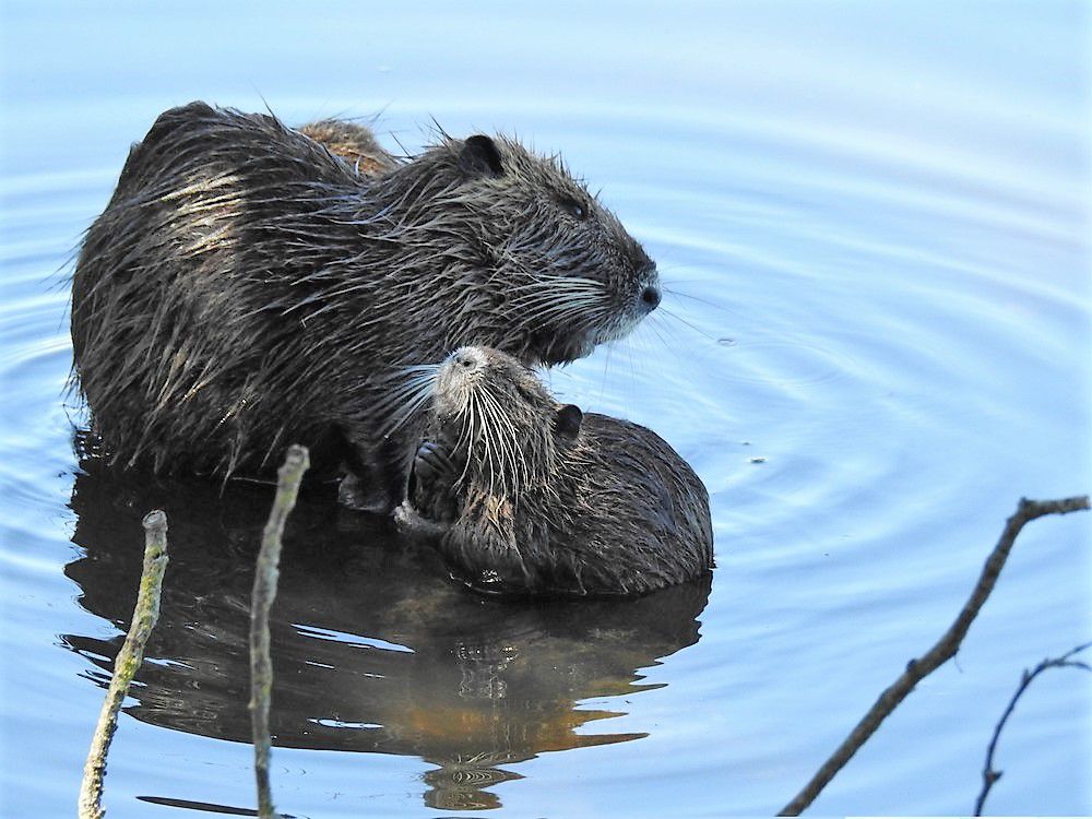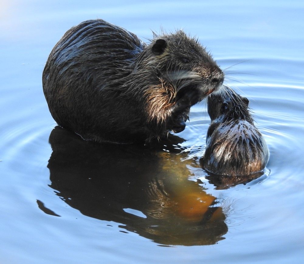Moments de tendresse entre une mère ragondin et son petit...